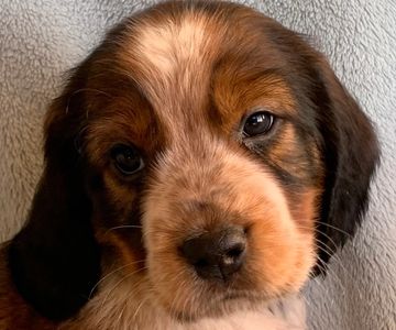 Black tipped sable are my personal favorites with the liver hairs tipped with black. It creates a light overlay of black over top the liver on this tri colored roan pup. Around the eyes and above the eyebrows it is very evident.
