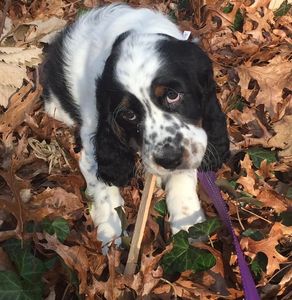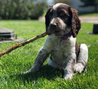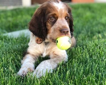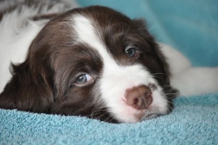 This sweetheart is a liver and white. She has only a couple spots on the white but likely will develop more. I call pups that are black and white or liver and white bi-colored puppies.