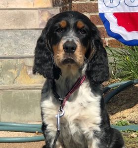 This is a beautiful blue tri-roaned puppy. They are a black tri with the roaning added. The black with the roaning creates a beautiful silver look.