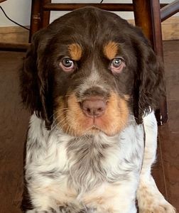 This pup is a liver roan. You can see the liver color blending with the white on his face which produces almost a silvery look. The legs have some roan as well. Some legs look splotchy instead of spots.